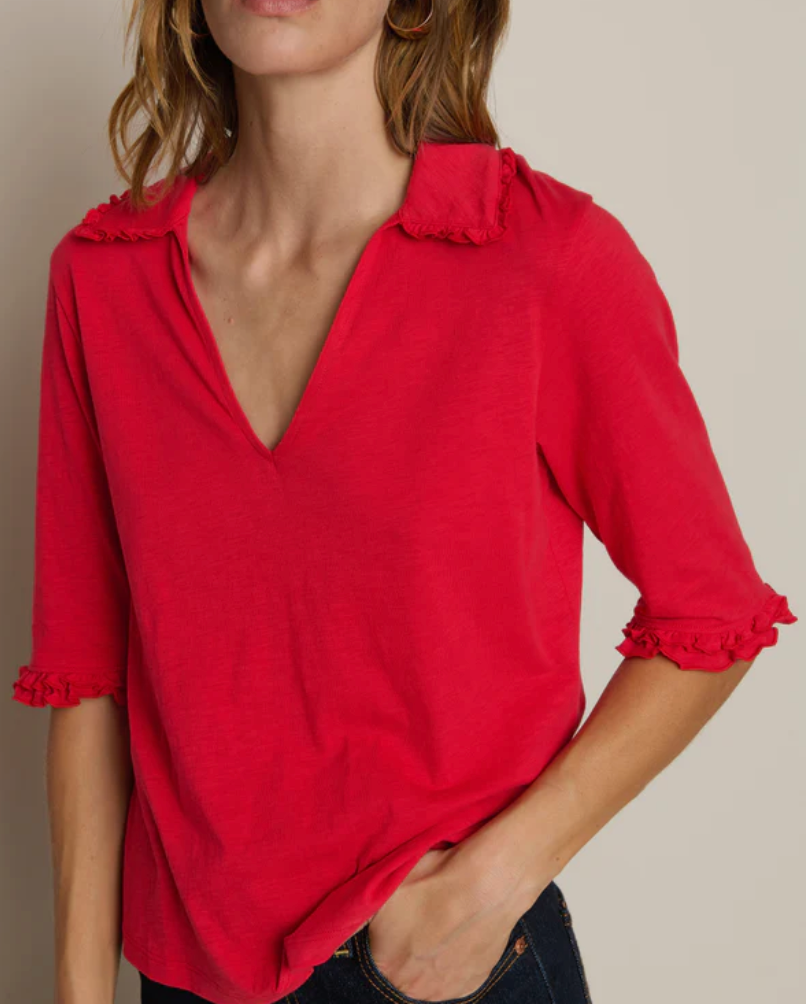 Always leave closet space for seasonless pieces. The Allison Collared Tee combines classic tailoring with subtle femininity—in 100% pima cotton for softness and easy upkeep. This piece features a collared neckline and ruffled sleeve trim for effortless polish.