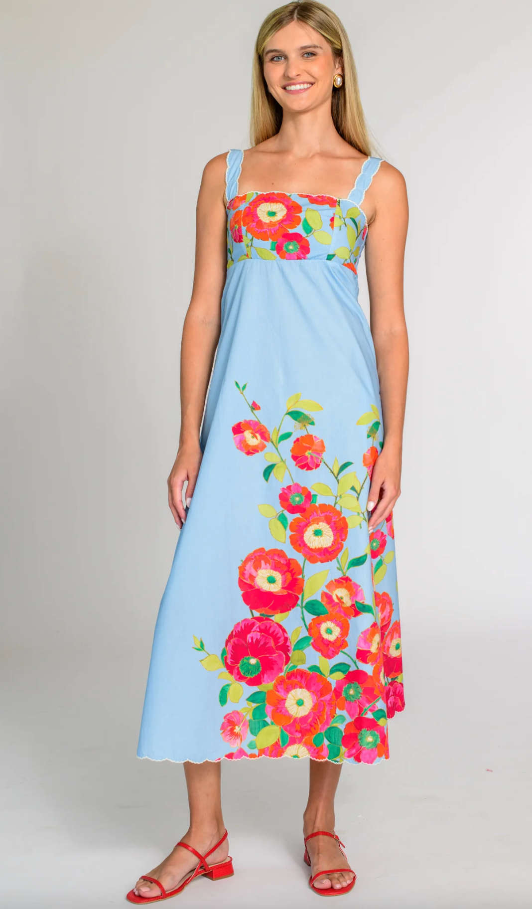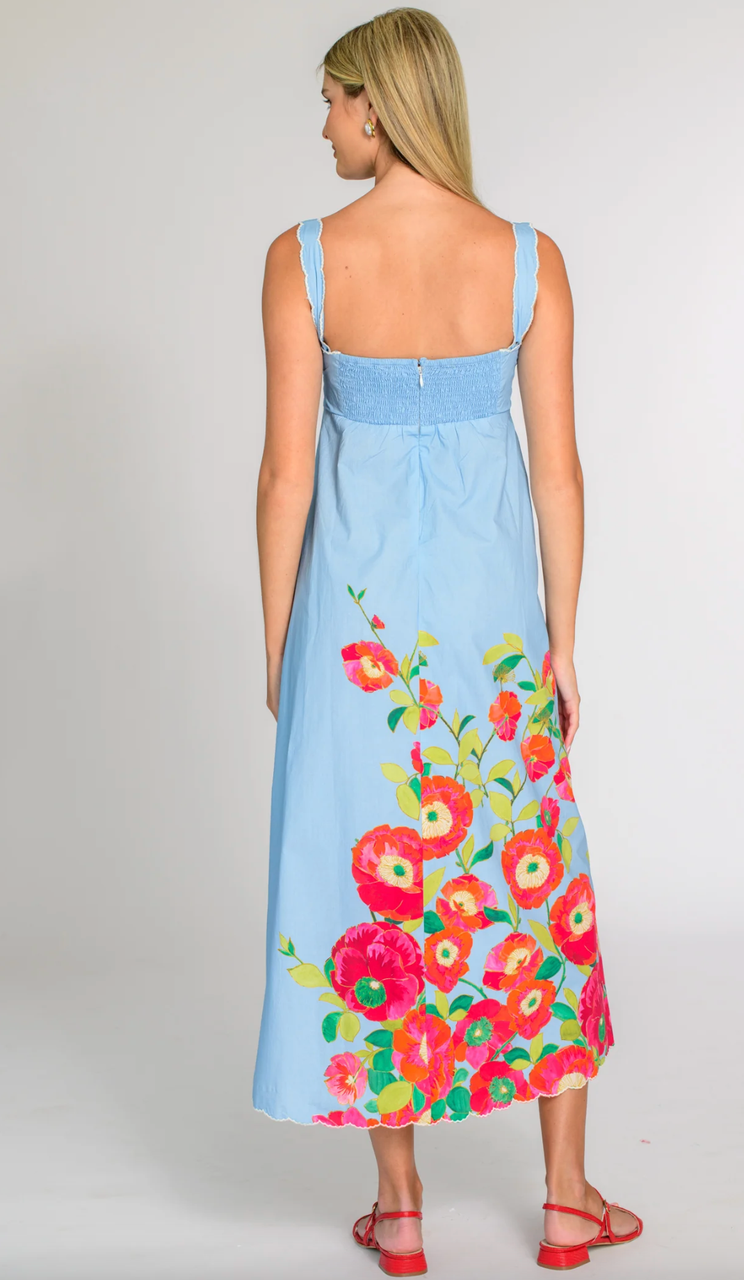 With her fitted empire bodice and flattering paneled skirt, Annalisa is a favorite silhouette all year long. She looks especially sweet in our poppies print on a blueberry poplin fabric, elevated with embroidery trim details. Adjustable straps and a smocked back offer a comfortable fit for the perfect midi dress.
