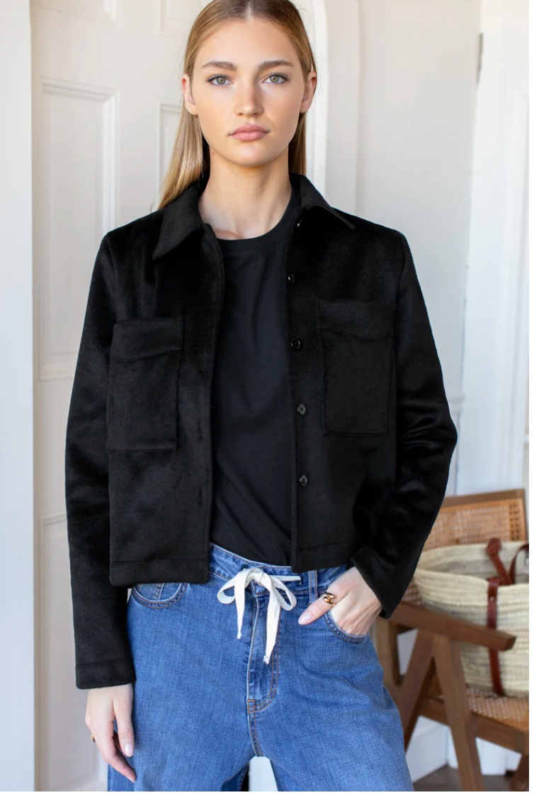 Combines luxe detailing with classic workwear styling. A staple piece for your transitional wardrobe. Wool Cashmere blend Classic jacket styling w/ collared neckline & inner back hanger loop Front button closures Patch pockets at front Full length sleeves Cropped, boxy fit