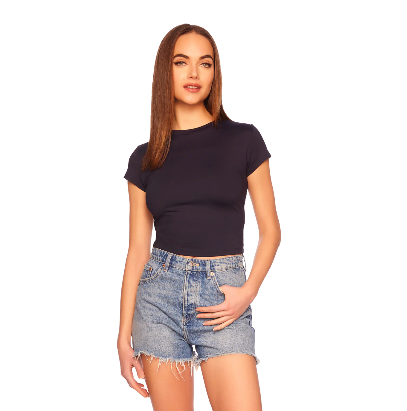 short sleeve 9" from waist VISTA (TM) signature comfort stretch fabric 90% nylon, 10% spandex machine washable, follow care instructions made in the USA