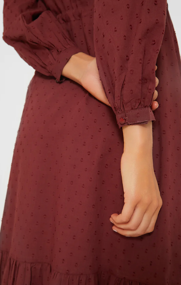 Organic Cotton w/ swiss dots Hand dyed using low impact dye Easy/breezy fit Set in sleeve with gathers at shoulder Lined Button closures on bodice Modesty placket under buttons Mandarin style collar Drawstring waist Button closure at cuff Tiered ruffle hem