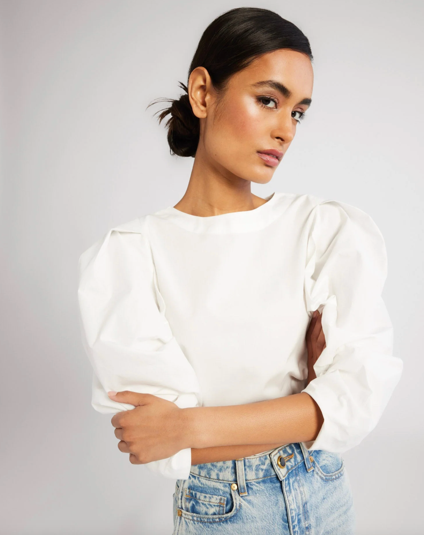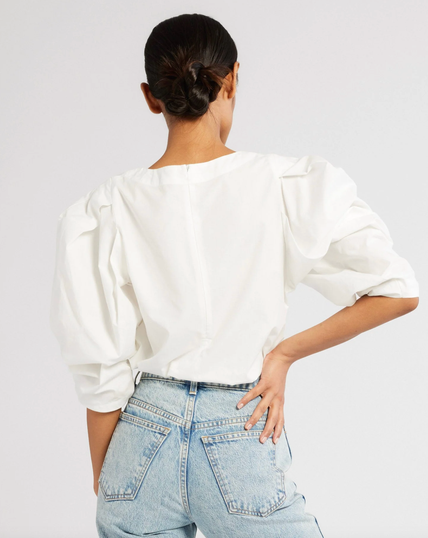 With bold puffed sleeves the Lila top feels both architectural and feminine. Constructed in simple cotton poplin with back zip. Gorgeous tucked into a skirt or vintage denim.