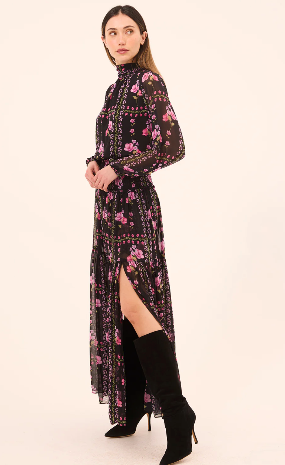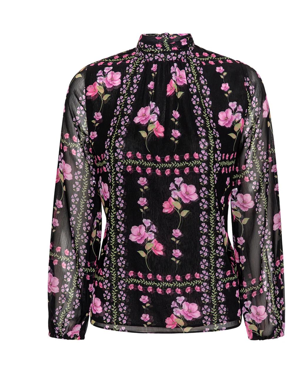The Lulu top is a dreamy high-neck silhouette cut from chic Midnight Lattice printed chiffon. Featuring a tie-back keyhole closure and long sleeves with elastic cuffs, this elegant style has sheer sleeves and a double-lined bodice for perfect coverage.