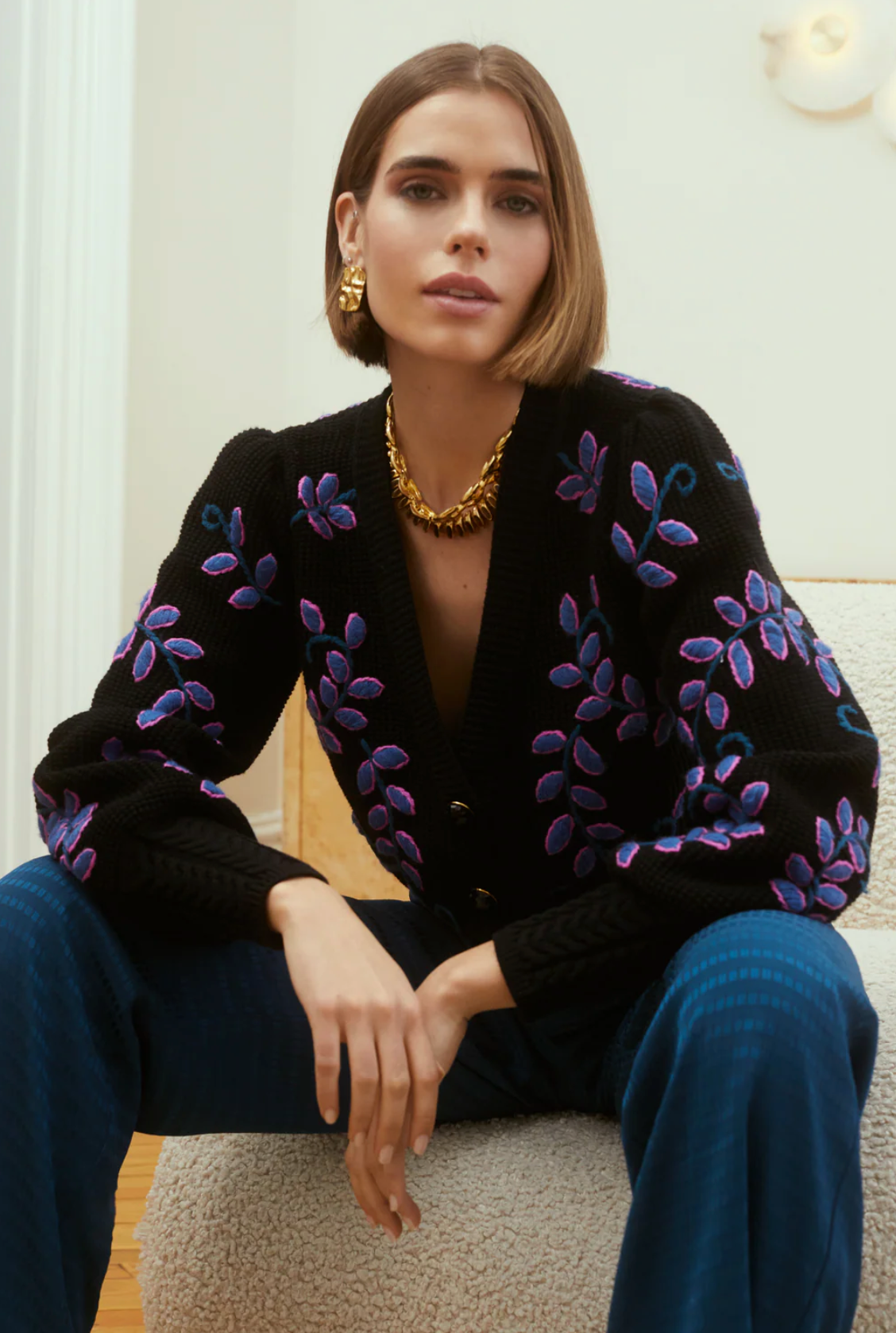 Our Best Selling Cardigan is back in bold embroidery throughout the body and sleeves. The V neckline leads to knit covered buttons at the center front and a fitted cable knit bottom band. The long cuffs are knit in a cable knit pattern, showing off the billowing sleeve shape. Slightly cropped in length.