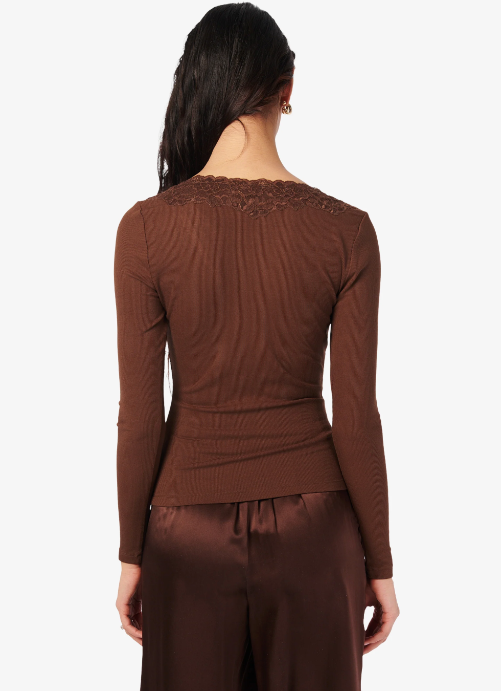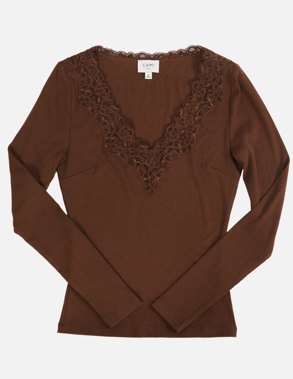 SUPER SOFT RIB KNIT V-NECK LONG SLEEVE TOP LACE AT NECKLINE HUGS THE BODY LENGTH SITS AT HIGH HIP