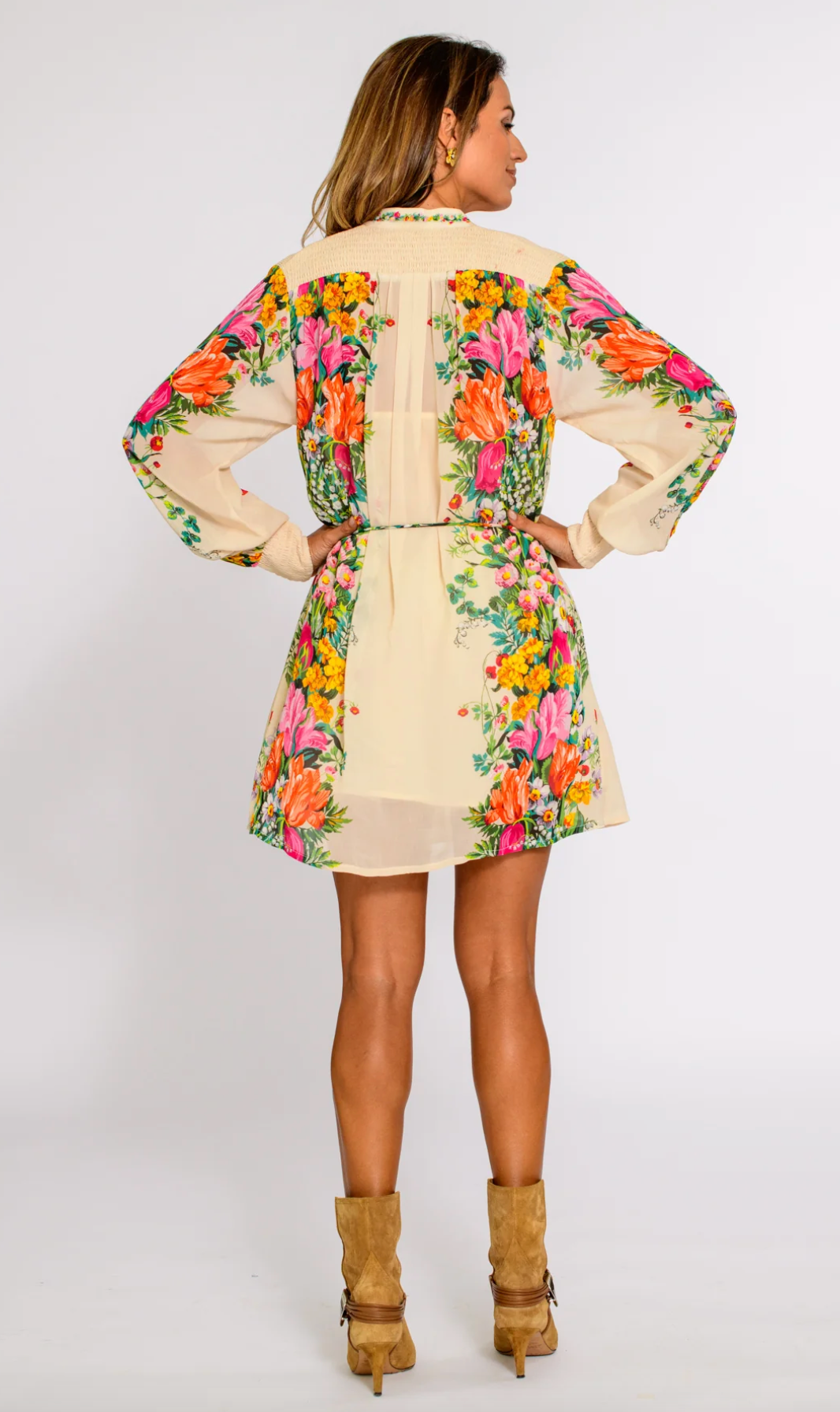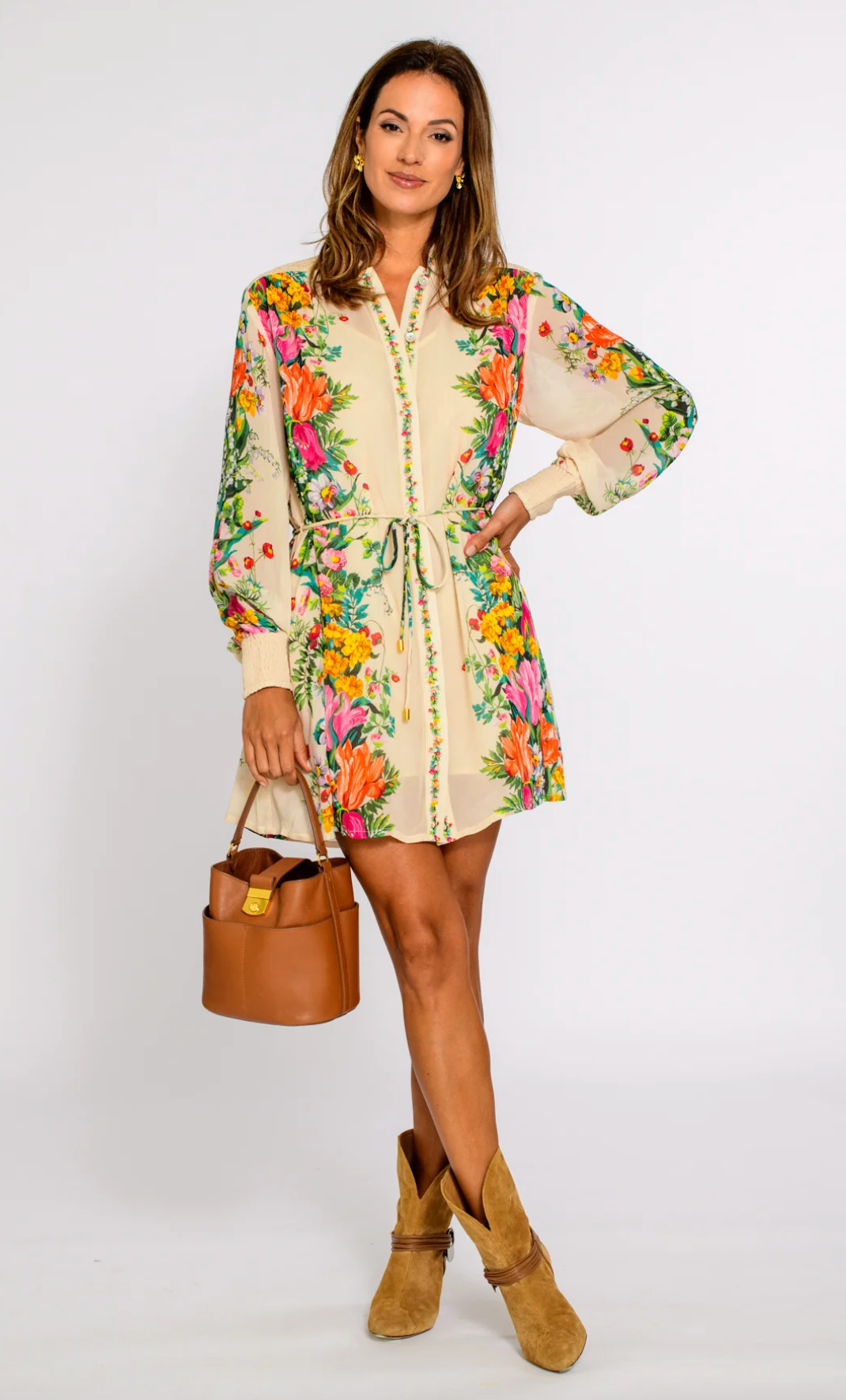 Tara is about to be the style of the season! Her easy wear, button down silhouette features a covered placket, balloon sleeves, and a cord belt cut from a stunning ivory floral print. Separate ivory slip included.