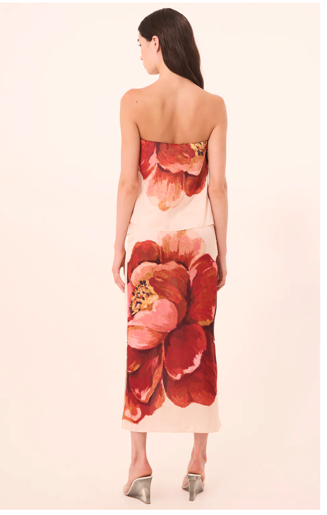 Charli is a chic slip skirt cut from pale pink satin with a large-scale peony print. This ankle-grazing silhouette features a side slit that hits just at the knee for effortless movement. Pair it with the coordinating Lyka top for a head-turning resort set.