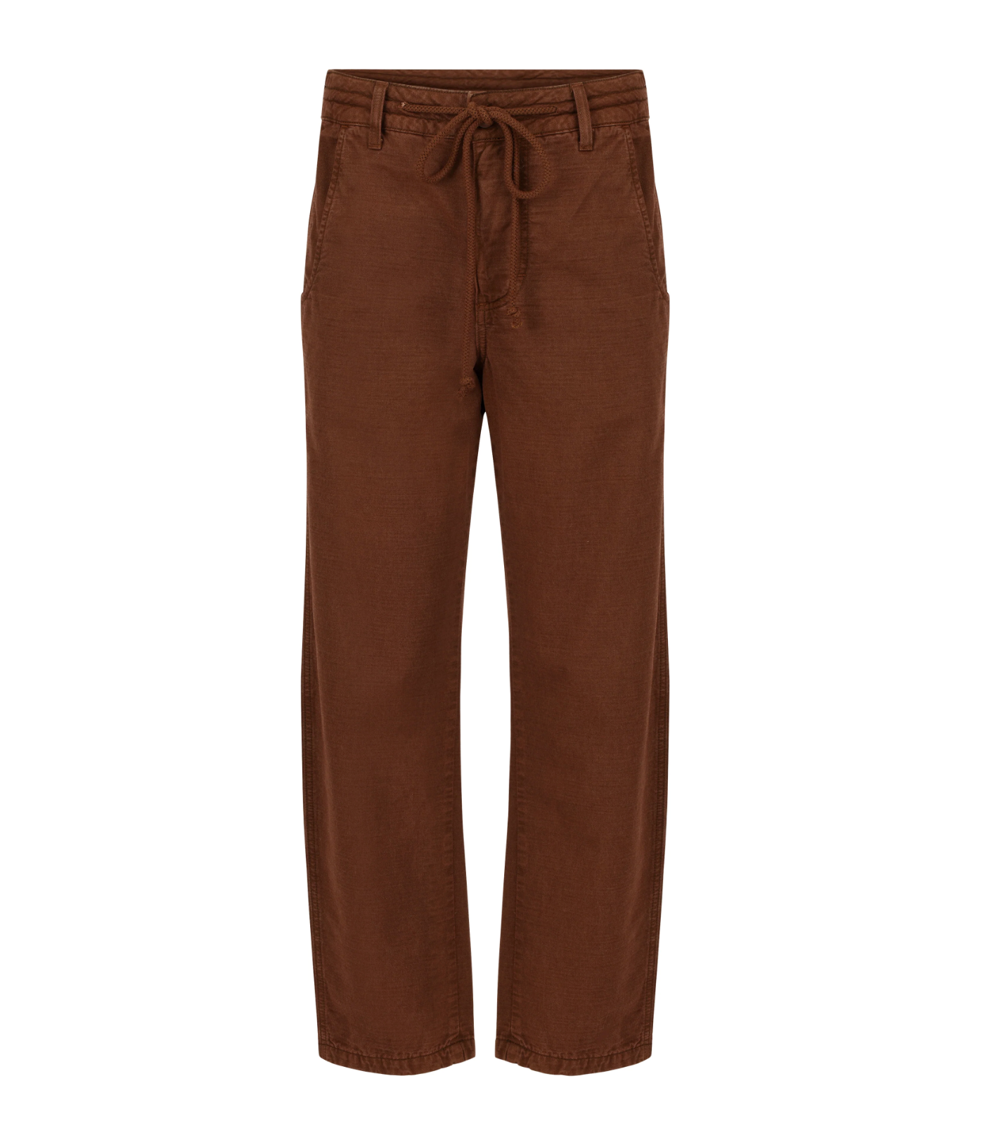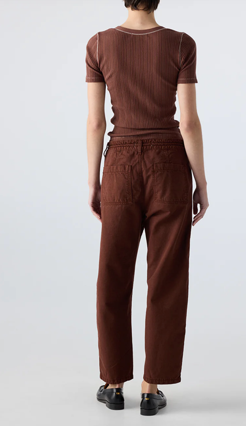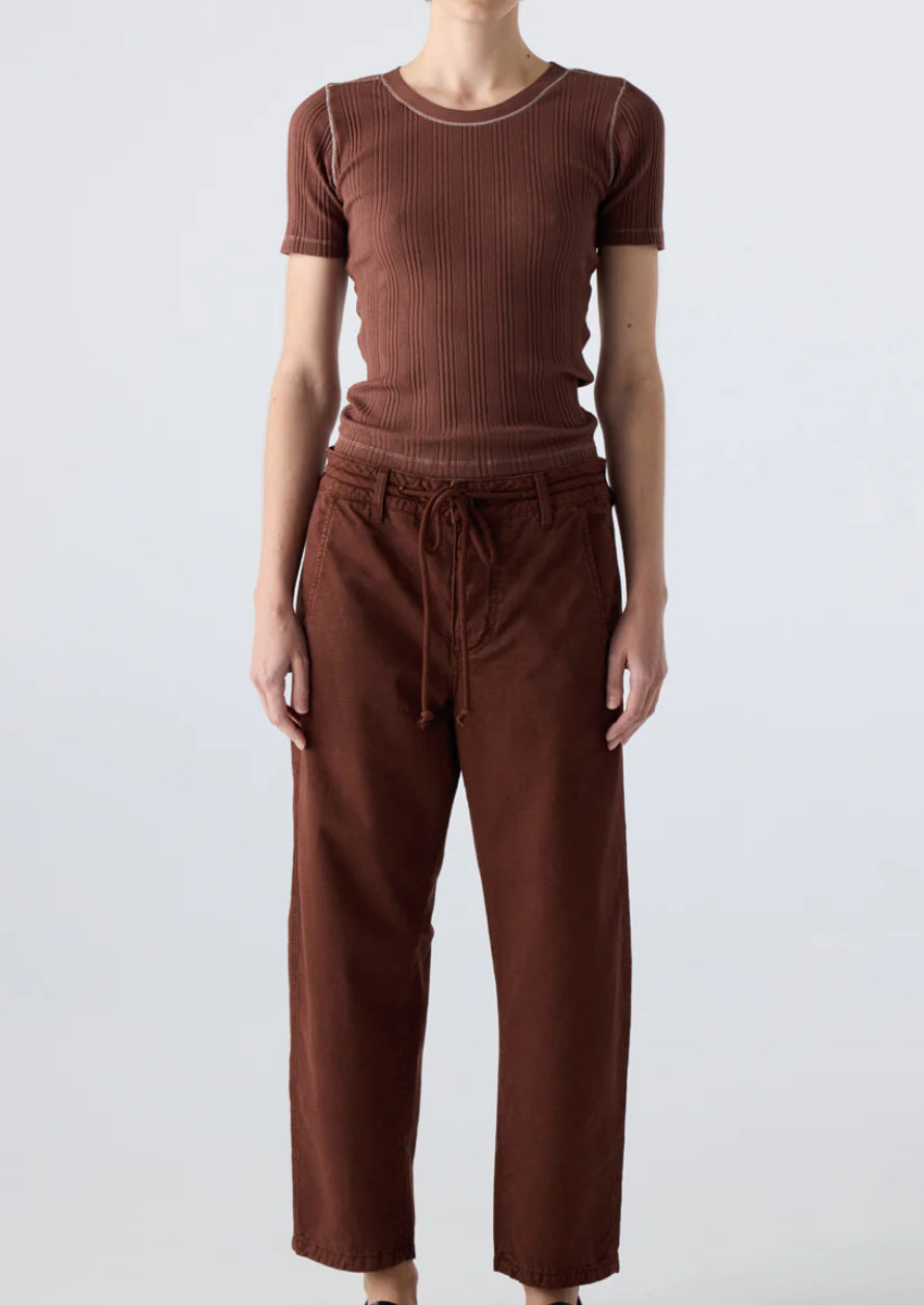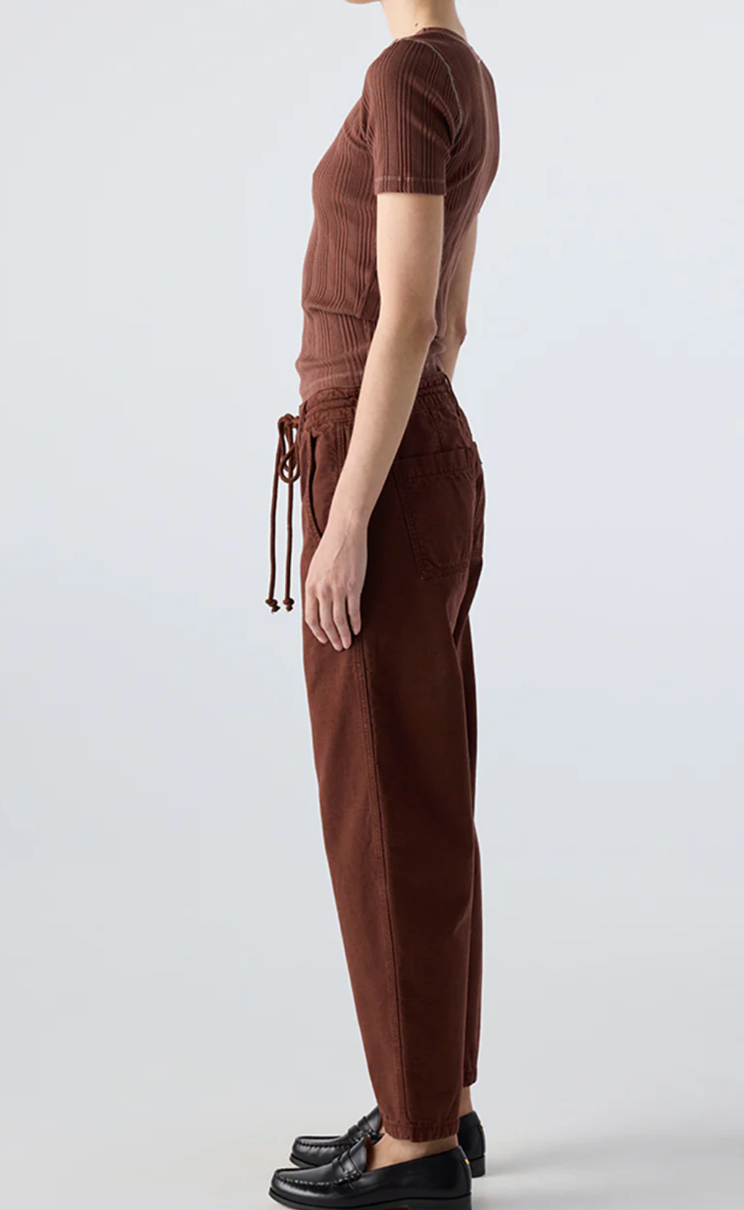 Sitting just below the waist with a dropped rise, this trouser features a subtle barrel shape. Finished with trouser-style pockets, a tailored hem, and a drawstring waist for a perfectly cinched fit.