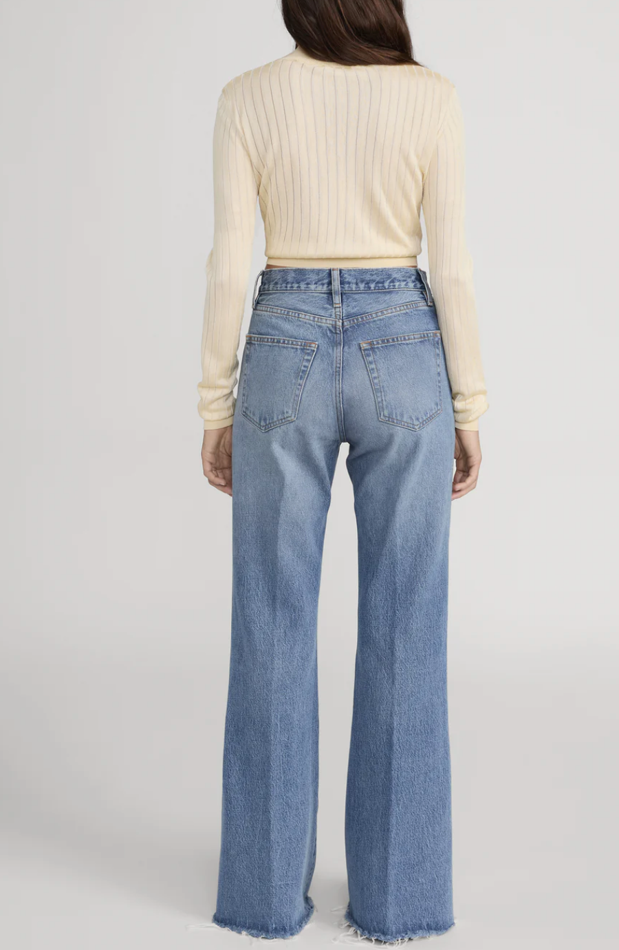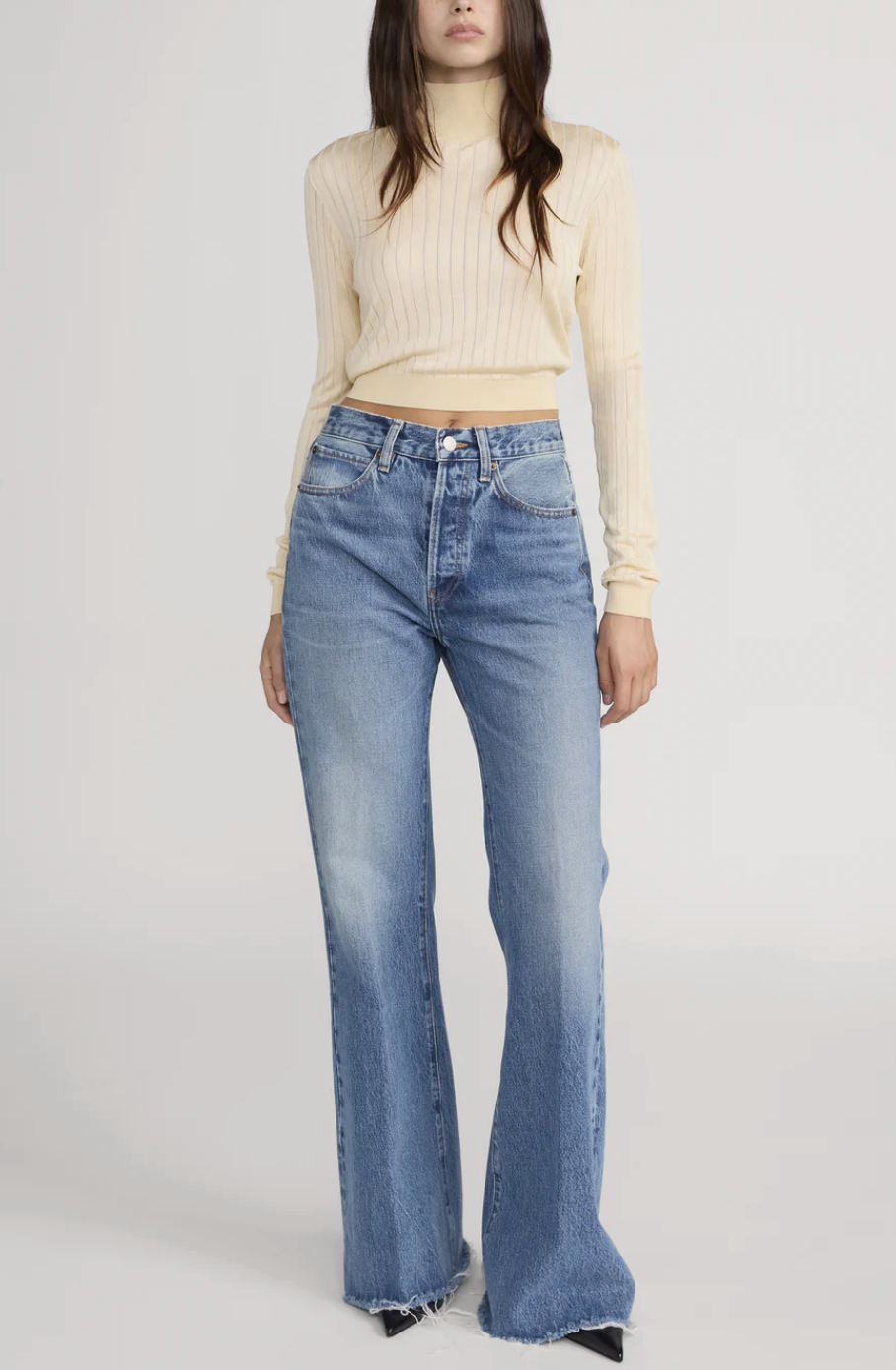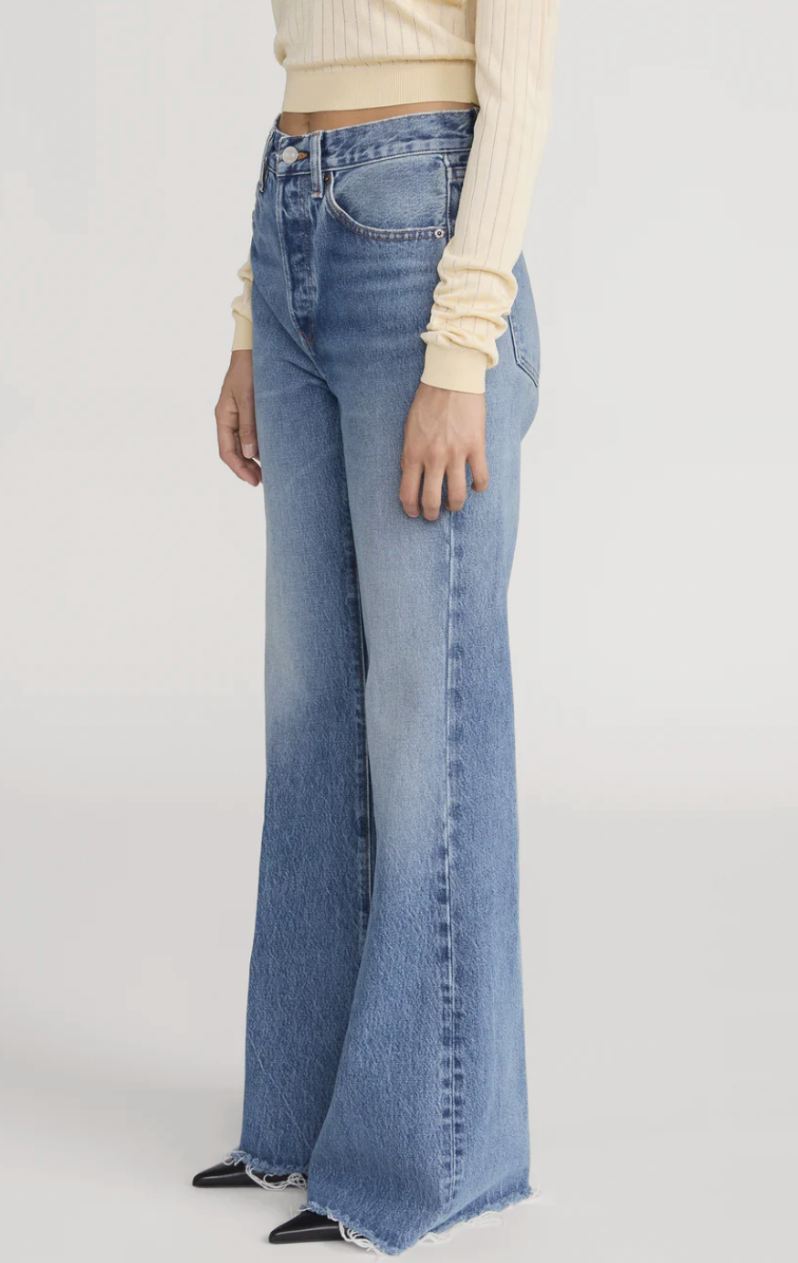 This laid-back jean sits just above the hip, and breaks into a relaxed, wide-leg flare. Crafted in classic non-stretch denim with a raw, frayed hem for an authentic vintage feel.