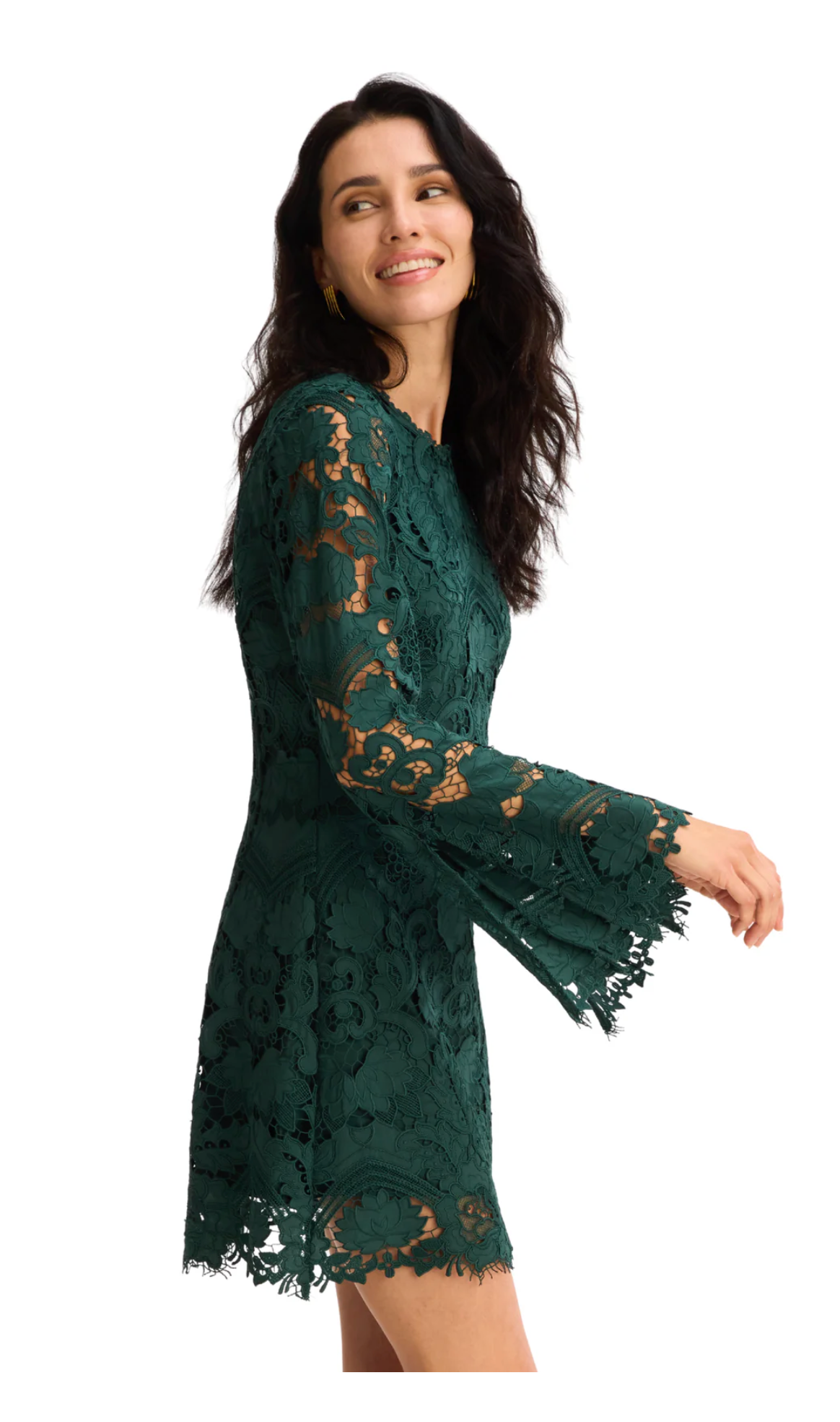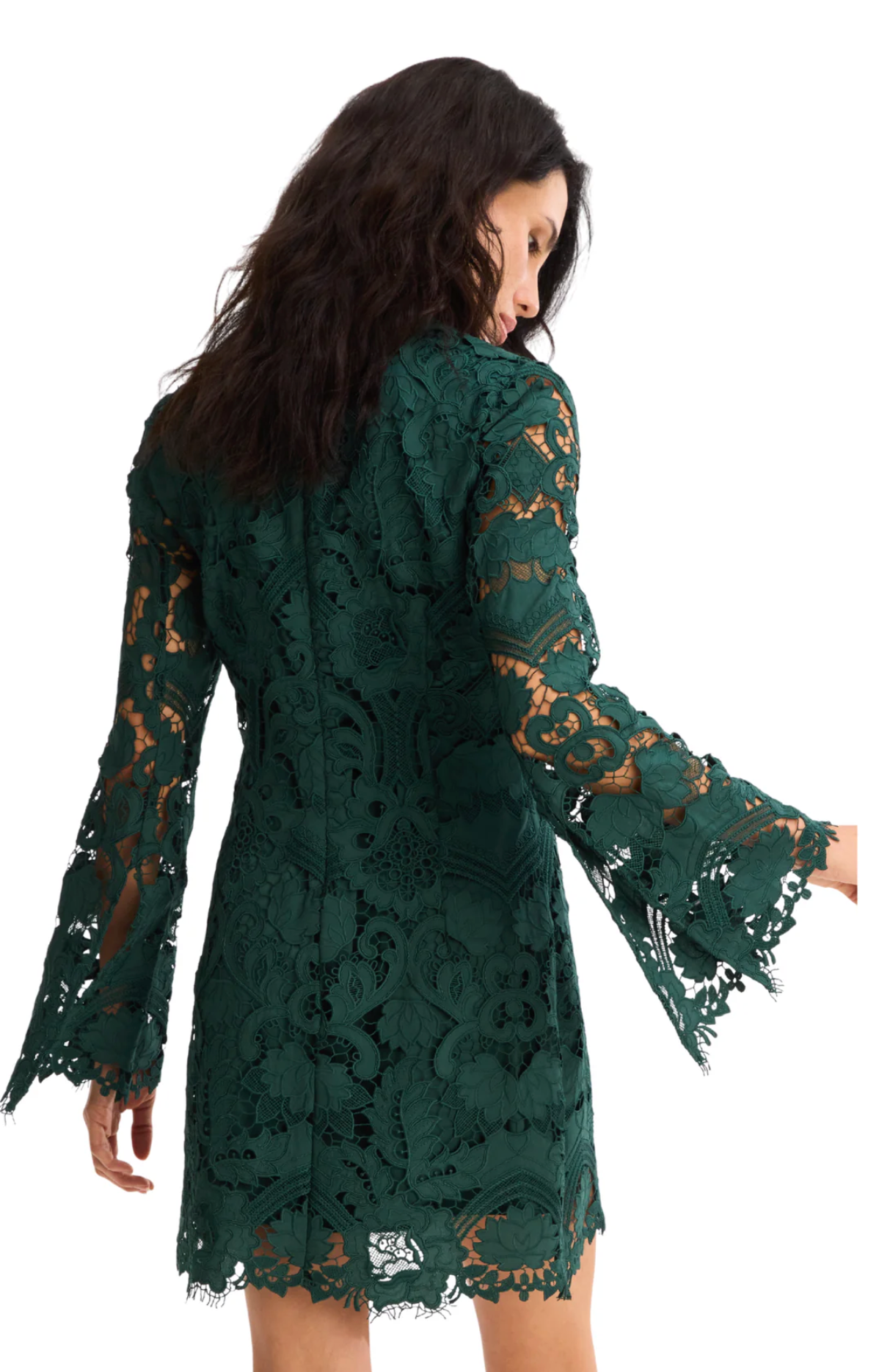 - Fit: The Daisy Dress is fitted through the bust and hips with a slight A-line shape. The lace is placement cut to ensure the motif is perfectly centered and the bottom scallops perfectly aligned. The long sleeve ends in a fun flare shape with a back slit. The scoop neck is finished in a custom lace trim. Darts at the bust and body offer shaping. Center back zipper and fully lined.