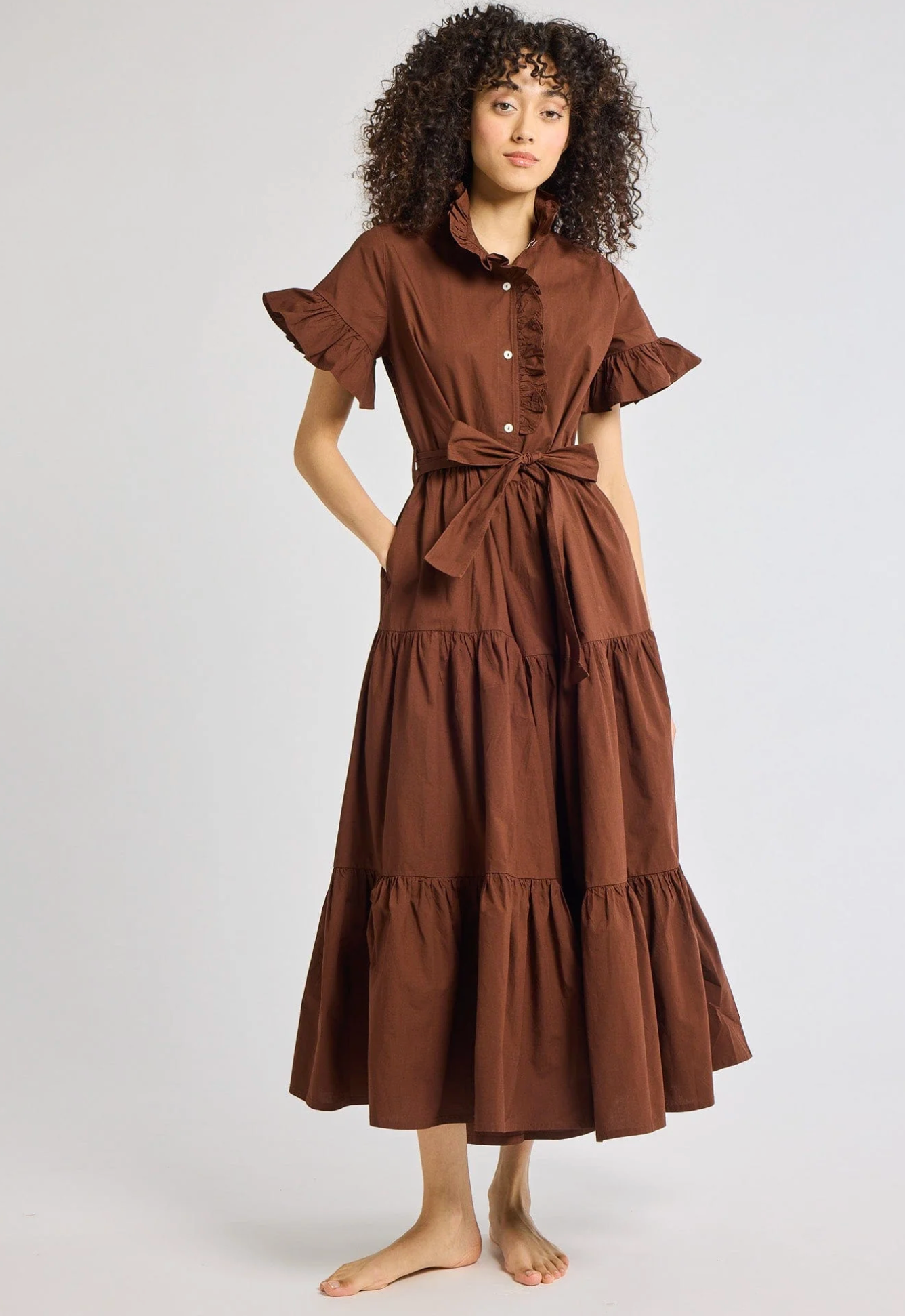 Victoria is a Mille staple. We added a tiered maxi skirt, to our best-selling Vanessa top et Voilà! Victoria has volume and movement but also looks clean and pulled together. The belted waist creates shape and a polished look. Button down top with ruffle placket and sleeve detail.