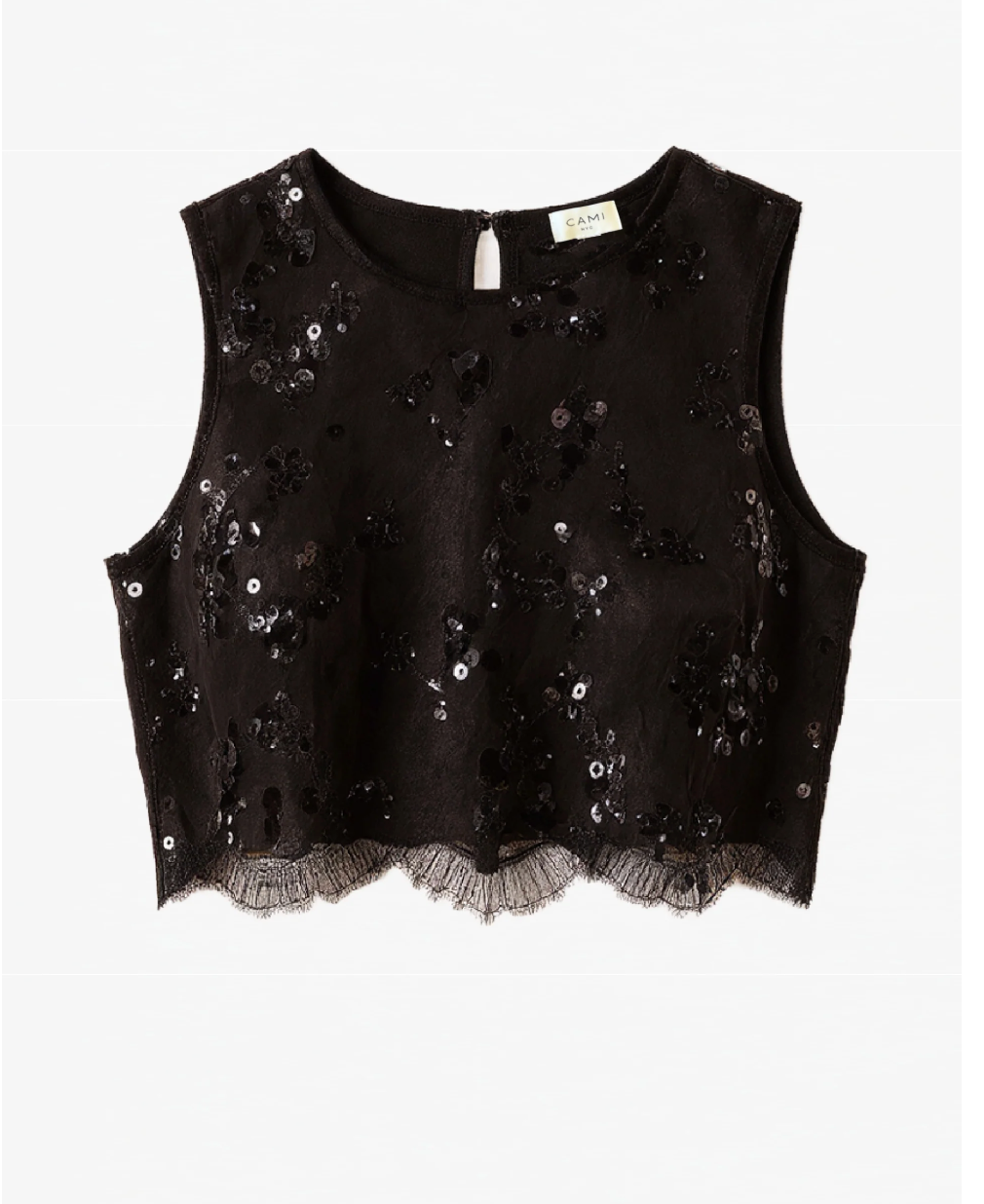 Crewneck sleeveless sequin lace top Metal zipper at centerback fully lined Bra-friendly