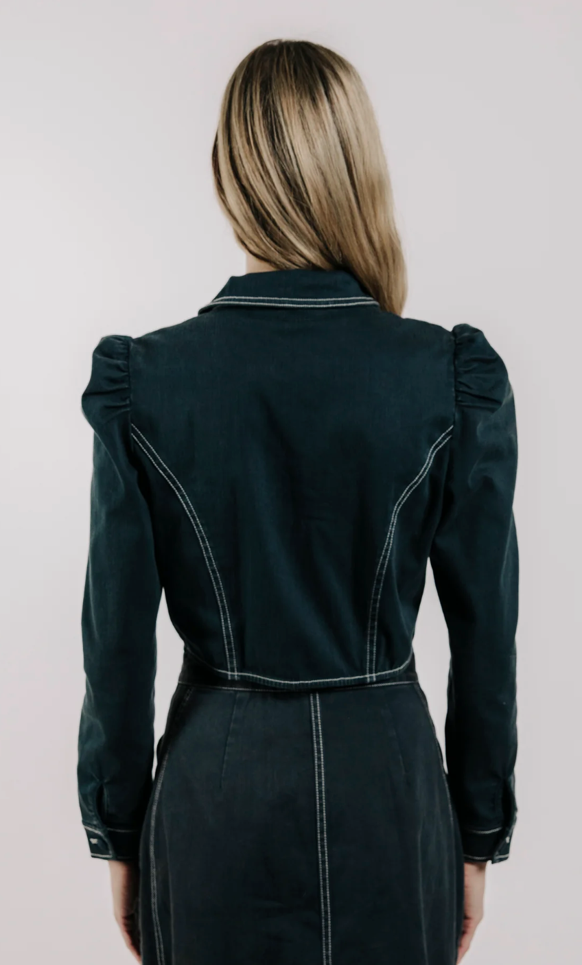 The Aurore Jacket is crafted in dark denim with contrast stitching and a structured silhouette. Featuring puff shoulders, a pointed collar, and a cropped fit