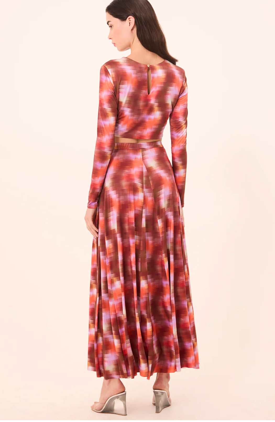 Lorenza is a flowing maxi skirt cut from modern pixelated wave print jersey. Designed with paneled construction that creates the illusion of soft pleats, it features an elasticated waistband in an easy pull-on style. Complete the set with the coordinating Acia top for a vibrant, head-turning look.